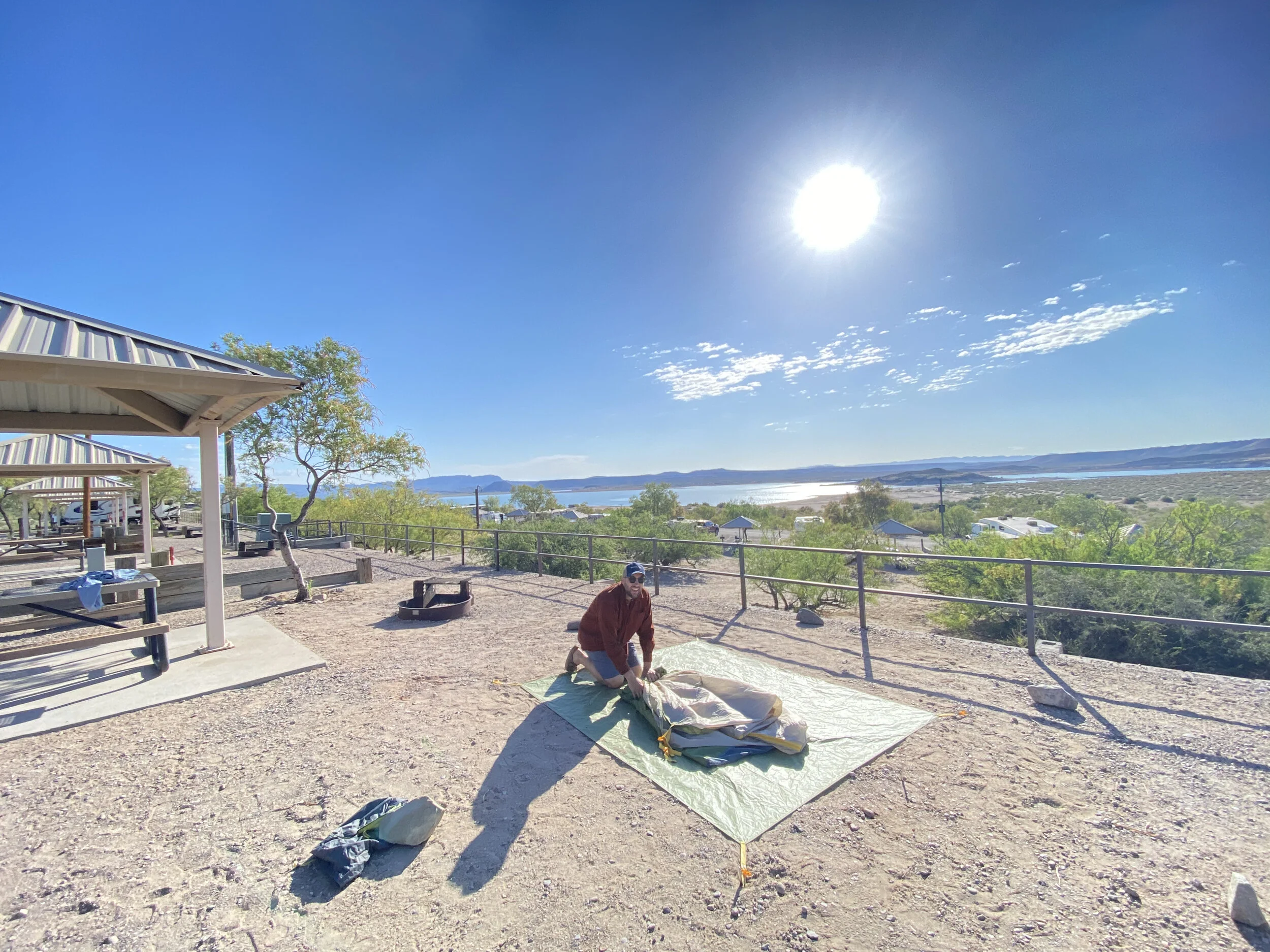 Camping in Elephant Butte State Park is between $8 - $14 a night. You can check in at the front gate and pay cash or card during business hours or pick up a yellow slip when theyâre closed and pay cash. There are a few different campgrounds but the ranger told us the best one was Lions Beach that time of year because the water level was so low at the others. There are tiers of camping that overlook the beach with spots available for tents, RVs, whatever youâve got.